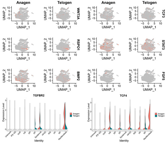 - Schlake, T.; Beibel, M.; Weger, N.; Boehm, T. Major shifts in genomic activity accompany progression through different stages of the hair cycle. Gene Expr. Patterns 2004, 4, 141–152. [Google Scholar] [CrossRef]