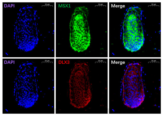 - Andl, T.; Ahn, K.; Kairo, A.; Chu, E.Y.; Wine-Lee, L.; Reddy, S.T. Epithelial Bmpr1a regulates differentiation and proliferation in postnatal hair follicles and is essential for tooth development. Development 2004, 131, 2257–2268. [Google Scholar] [CrossRef] [PubMed]