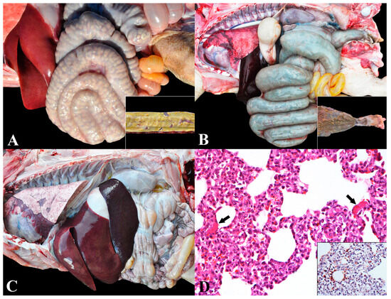- Pereira, P.R.; Caprioli, R.A.; Hammerschmitt, M.E.; Sonne, L.; Pavarini, S.P.; Driemeier, D. Intestinal Lesions in Pigs Slaughtered in Rio Grande Do Sul, Brazil. Pesq. Vet. Bras. 2018, 38, 823–831. [Google Scholar] [CrossRef]