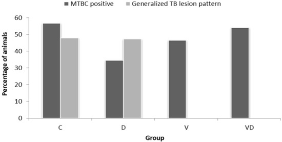 Percentage of animals infected by MTBC and suffering generalised TB pattern in different groups of animals: C (Control), D (Dewormed), V (PCV2 Vaccinated), VD (PCV2 Vaccinated and dewormed). No animals displaying generalised TB lesions were recorded in vaccinated groups (V and VD).