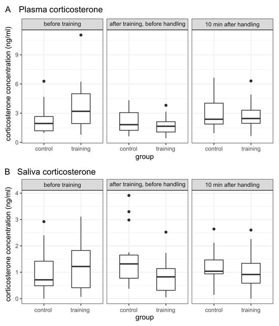 Corticosterone levels were determined using a Corticosterone ELISA Kit (Neogen®, Ayr, Scottland, UK) and the associated analysis protocol. The Microplate Absorbance Reader SUNRISE (TECAN, Crailsheim, Germany) and the Magellan evaluation software (SW MAGELLAN V7.2 STD5PC XP VISTA WIN7/8, TECAN, Grödig, Austria) were used to retrieve and evaluate the data. Optical density was determined at a wavelength of 450 nm using the reference wavelength of 620 nm. The ELISA used in this study was verified by determining intra- and inter-assay precision prior to sample analysis. The intra-assay was performed by measuring three plasma samples in three duplicates each. For the inter-assay, two single duplicate assays prepared separately were analyzed and the randomly selected second of the three intra-assay duplicate values was added as the third value for each sample. Verification of the ELISA with respect to saliva samples was not performed due to the very small sample volume. In the subsequent analysis, all plasma or saliva samples from one animal, as well as equal numbers of samples from training and control group animals, were analyzed on the same ELISA plate.