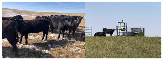 Measuring the dry matter intake (DMI) of grazing beef cattle is a significant challenge from basic and applied research and production aspects. For estimating forage utilization and the amount of land area required for cattle grazing extensive rangelands, it is essential to determine the animal unit months (AUMs). For AUMs, the amount of forage needed per animal unit (AU) is defined as a 454 kg cow consuming 2.6% of BW on a dry matter basis, thus equating to 354 kg forage being consumed over one month (1 AUM) [1]. The DMI is required to determine stocking rates and supplementation requirements. The variation in estimated DMI of grazing cattle introduces error at the herd level since estimated DMI is based on full BW multiplied by a percentage of BW. The percentage of BW varies depending on animal class, production phase (e.g., lactating vs. dry), and forage quality [2]. For example, a lactating cow eating low-quality forage (<52% total digestible nutrients) consumes approximately 2.2% of BW on a dry matter basis, whereas a lactating cow eating high-quality forage (>59% total digestible nutrients) consumes 2.7% of BW on a dry matter basis [2,3]. Differences in DMI and BW can also significantly affect stocking rates. For example, a 227 kg heifer consuming 2.5% of BW on rangeland with 700 kg ha−1 available for consumption (i.e., 25% of total forage; 2800 kg ha−1) would require 0.24 ha AUM−1, whereas a 381 kg heifer consuming 2.5% of BW would require 0.42 ha AUM−1.