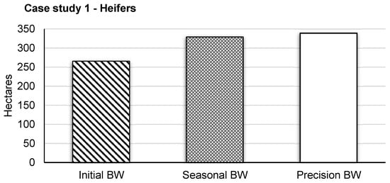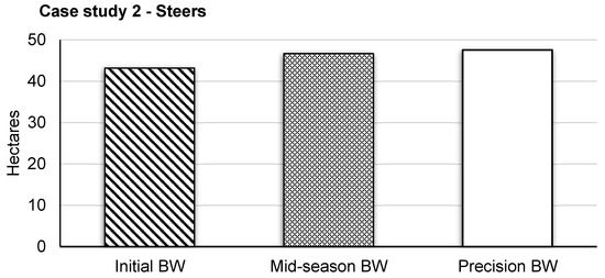 Total hectares required for each case study (replacement heifers and grazing steers) estimated according to total forage production (initial or peak), and intake estimated as a function of BW measured according to each of the three scenarios, initial BW, estimated mid-season BW, and individual precision BW.