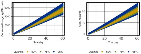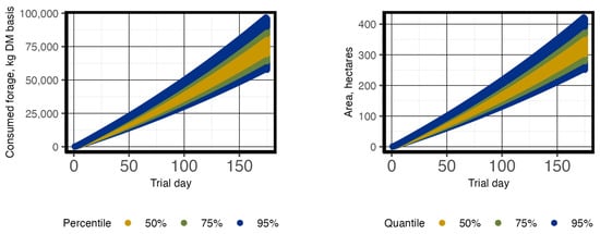 Finally, we conducted a Monte Carlo analysis (10,000 runs) to determine the percentiles of potential variation from %BW on AUMPSM calculations on a daily basis impacting total hectares required and total forage used for each grazing period. The BW parameters ranged from 1.8 to 2.7% using a univariate normal distribution.