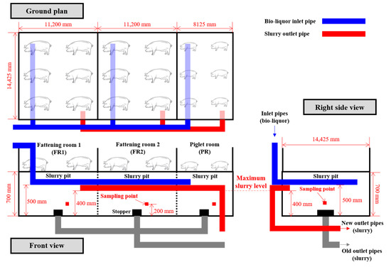 Circulation pipes were installed in the BCS-SP to distribute the bio-liquor equally in each compartment (Figure 2). The BCS-SP was installed with additional inlet and outlet pipes made of poly-ethylene (∅ 50 mm) for the real-time circulation based on the preset algorithm. The inlet and outlet pipes for bio-liquor circulation were placed at heights of 500 and 400 mm from the bottom of the slurry pit, respectively. In addition, the inlet and outlet pipes were located on opposite sides of the slurry pit to avoid flux passing and ensure uniform circulation. When the water level was increased by the circulation of the bio-liquor, the slurry manure and bio-liquor mixture naturally overflowed into the slurry storage tank through the outlet pipe. In contrast, in NCS-SP, the slurry manure was discharged into the slurry storage tank by opening a stopper in each compartment when the slurry pit was full, as in conventional practice.