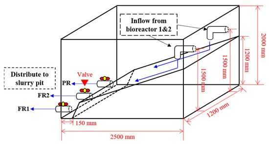 As shown in Figure 3, the distributor had a total volume of 6 m3 and the influxes from bioreactors 1 and 2 sloped down to the front of the outlet, connecting to FR1, FR2, and PR. After the bio-liquor flowed from the bioreactor, it gathered in the lower part of the distributor, where the valve was located, and flowed into each compartment of the slurry pit through the pipes connected to FR1, FR2, and PR. Furthermore, polyvinyl chloride valves were installed on each circulation pipe connecting the BCS-SP and the distributor to control the inflow of the bio-liquor into each compartment.
