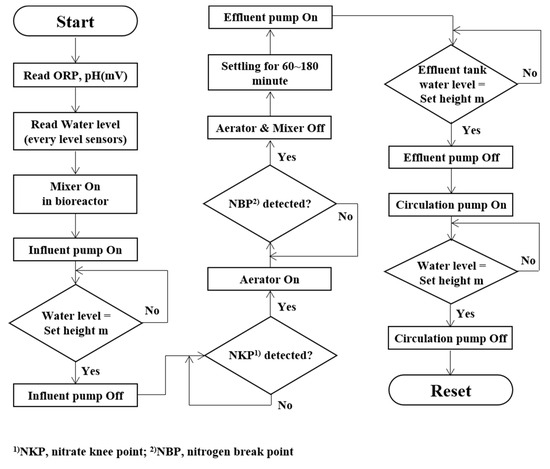 A real-time operational algorithm for the BCS is shown in Figure 4. The operational concept of the bioreactor is the circulation of the bio-liquor with a focus on nitrogen behavior. Further details on the real-time detection of the nitrogen breakpoint (NBP) and nitrate knee point (NKP) were obtained by monitoring the ORP and pH–time profiles from previous research [29,30,35]. The bioreactor was operated repeatedly in the following sequence: feeding, mixing, NKP detection, aeration, NBP detection, settling, and circulation. Water level signals determine the amount of influent feeding, circulation of the bio-liquor, and discharge of the effluent. The pumps were operated according to the algorithm and stopped once the target water level was reached, ensuring a balance between the inflow and outflow in the bioreactor.