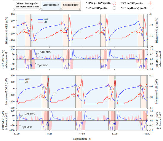 During the settling phase, NKP, which indicates the termination of denitrification, appeared in the ORP and pH (mV) time profiles. In this phase, ORP decreased rapidly below −300 mV (○ symbol in Figure 5) indicating NKP. However, the pH(mV) suddenly increased (+ symbol in Figure 5) at the point where NKP appeared in the ORP-time profile, indicating that NKP also appeared in the pH (mV)–time profile. Previous studies have confirmed that there are differences between ORP values under anoxic and anaerobic conditions [29,30,39,40,41]. When the ORP decreased below −300 mV, the bioreactor became anaerobic under anoxic conditions. Additionally, Tanwar et al. reported that the pH decreased under anaerobic conditions owing to fermentation [42].