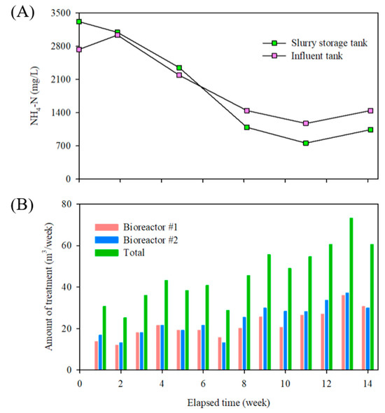Figure 7 shows that the amount of wastewater treated in the real-time controlled BCS increased over time. As the bio-liquor circulated continuously into the slurry pit, the concentration of NH4-N in the slurry storage and influent tanks decreased constantly (Figure 7A). Figure 7B illustrates the increasing pattern in the amount of wastewater treated. The total amount of wastewater treated in bioreactors 1 and 2 was 30.6 m3/week in the first week, which gradually increased over time to a maximum of 73.2 m3/week in the 13th week. The primary reason for this increase was the reduction in nitrogen and organic matter in the influent due to the circulation of the well-treated bio-liquor into the slurry pit.