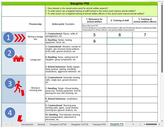 Screenshot of MS Excel©-based workbook (Supplementary File Table S1) used for the Delphi survey on animal welfare relevance and training potential of processing steps along the transport and slaughter chain for cattle and pigs (Table 1). Spreadsheet ‘Slaughter PIG’ is partly filled out with numbers between 0 and 10 as an example.