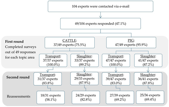 In the first survey round, 49 experts returned their spreadsheets (response rate: 47.1%, 49/104). Of these 49 experts, a total of 37 filled out the spreadsheet for ‘Transport CATTLE’ and 33 for ‘Slaughter CATTLE’. The spreadsheets for ‘Transport PIG’ and ‘Slaughter PIG’ were completed by 47 and 41 experts, respectively (Figure 2).