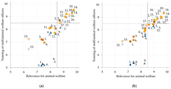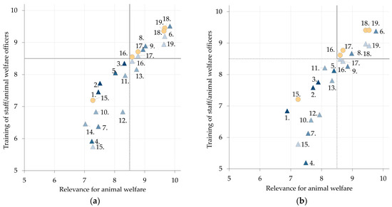 Scatterplots showing the average scores for all experts on action points in the topic areas ‘Transport CATTLE’ (a) and ‘Transport PIG’ (b) scored in the second round of the Delphi survey on animal welfare relevance and training potential of processing steps along the transport and slaughter chain for cattle and pigs. Blue triangles represent the relationship between rating of action points on ‘Relevance for animal welfare’ (X-axis) and ‘Training of staff’ (Y-axis). Orange circles represent the relationship between rating of action points on ‘Relevance for animal welfare’ (X-axis) and ‘Training of animal welfare officers’ (Y-axis). Different shadings of triangles refer to the categorisation of the action point of the respective process step (dark to bright = process steps 1 to 5). Numbers relate to individual action points (see Supplementary File Table S1). High scores (>8.5) relate to a high relevance for animal welfare aspects and a high possibility to improve animal welfare through training. Further details can be found in Figure A1.