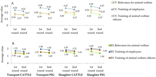 Average coefficients of variation (CV, panel A) and standard deviations (SD, panel B) calculated for the three questions (green square: ‘1. How relevant is the named action point for animal welfare aspects?’; blue triangle: ‘2. To what extent can a targeted training of staff involved in this action point improve animal welfare?’; brown circle: ‘3. To what extent can a targeted training of animal welfare officers in this action point improve animal welfare?’) and compared between the first and second round in the Delphi survey on animal welfare relevance and training potential of processing steps along the transport and slaughter chain for cattle and pigs. Reduction in CV and SD relate to an increased consensus among experts on the rating of items.