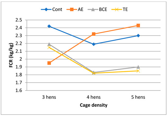 The effect of cage density by plant extract interaction on the food conversion ratio (FCR) (SEM = 0.08 and p < 0.05). (Cont: Control, AE: Anise extract, BCE: Black cumin seed extract, TE: Thyme extract).
