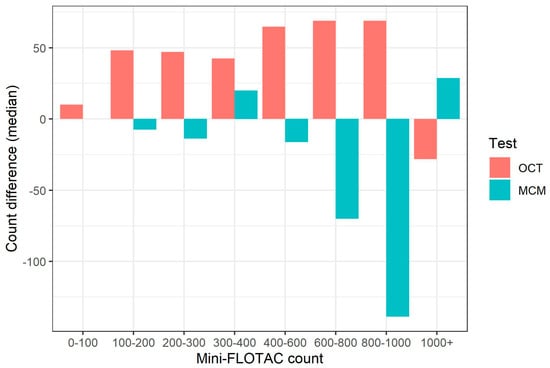 Median count difference between OCT and MCM compared to MF at different MF count ranges.
