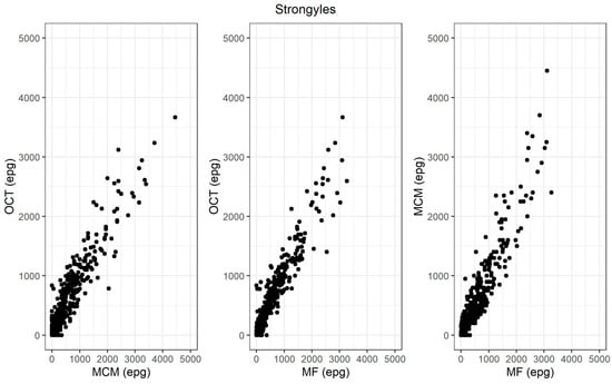 Scatter plot of the correlation between OCT, MCM and MF strongyle egg counts (eggs per gram).