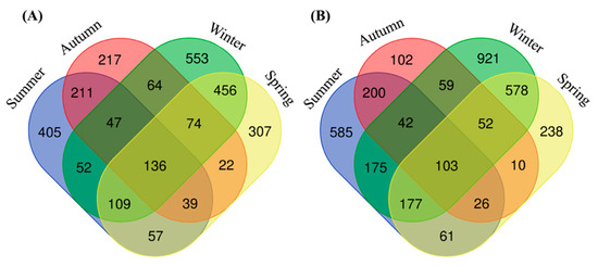 Venn diagrams show unique and shared bacterial ASVs across four seasons in (A) Baikal teal and (B) common teal.