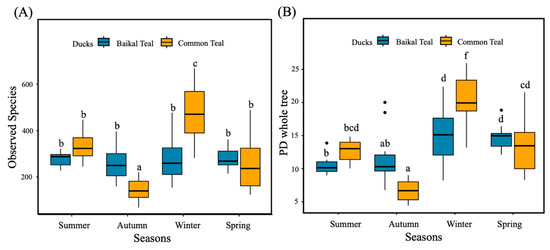 Alpha diversity of intestinal bacterial communities in captive Baikal teal and common teal during four seasons. (A) Boxplot for comparison of species richness (Observed species) and (B) Boxplot for comparison of phylogenetic diversity (PD whole tree). Data were analyzed using One-way ANOVA with Duncan test and difference letters represent the significant difference (p < 0.05).