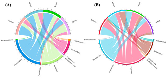 The chord diagram illustrates the proportionate distributions of the dominant bacterial phyla in two captive ducks during four seasons. (A) Dominant phyla in Baikal teal and (B) dominant phyla in common teal.