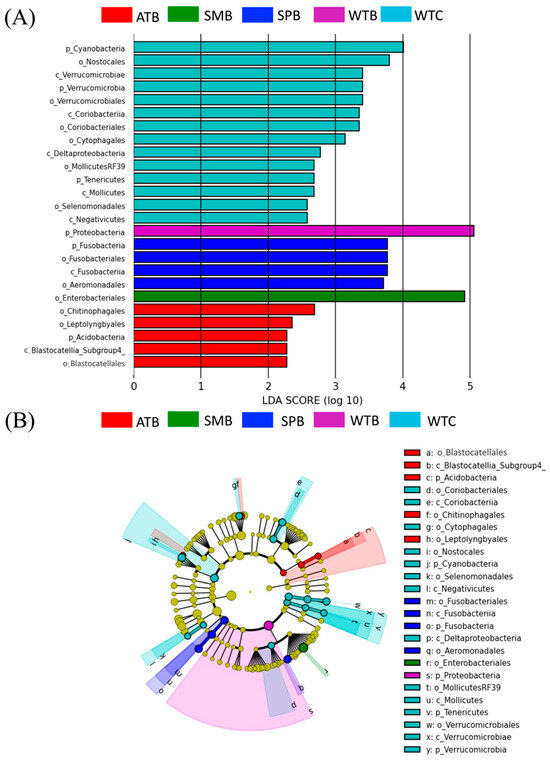 Linear discriminant analysis effect size (LEfSe) analysis of bacterial abundance differences among groups. The Kruskal-Wallis test (0.05) and LDA threshold score of 2.0 obtained the differences among classes. (A) The bar plots represent the significantly differential taxa between groups, based on effect size (LDA score). (B) The cladogram shows the difference in enriched taxa between groups. ATB (autumn Baikal teal), SMB (summer Baikal teal), SPB (spring Baikal teal), WTB (winter Baikal teal), and WTC (winter common teal). The letters in front of OTUs represent taxonomic levels (p = phylum, c = class, and o = order).