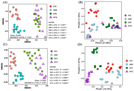 The community structure of bacterial communities during four seasons in captive dabbling ducks was assessed by beta diversity patterns using NMDS, PCoA analysis, and ANOSIM R-statistics. The significant difference was denoted with asterisks (*** p < 0.001). (A) NMDS in Baikal teal, (B) PCoA in Baikal teal, (C) NMDS in common teal, and (D) PCoA in common teal. SMB (summer Baikal teal), SMC (summer common teal), ATB (autumn Baikal teal), ATC (autumn common teal), WTB (winter Baikal teal), WTC (winter common teal), SPB (spring Baikal teal), and SPC (spring common teal).