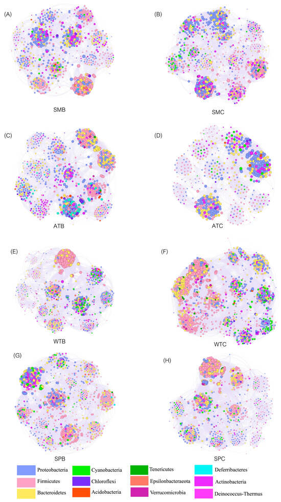 Co-occurrence patterns of bacterial communities in different groups. (A) SMB (summer Baikal teal); (B) SMC (summer common teal); (C) ATB (autumn Baikal teal); (D) ATC (autumn common teal); (E) WTB (winter Baikal teal); (F) WTC (winter common teal); (G) SPB (spring Baikal teal); and (H) SPC (spring common teal). The size of each node is proportional to the number of degrees.