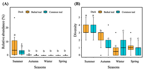 The differences in (A) relative abundance and (B) diversity of potentially pathogenic bacteria in captive Baikal teal and common teal during four seasons. Data were analyzed using One-way ANOVA with Duncan test and difference letters represent the significant difference (p < 0.05).