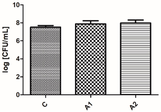 The logarithm of the number of colony-forming units (CFUs) on ENDO medium per mL. C—control group, A1 and A2—groups containing crude fibre concentrate.