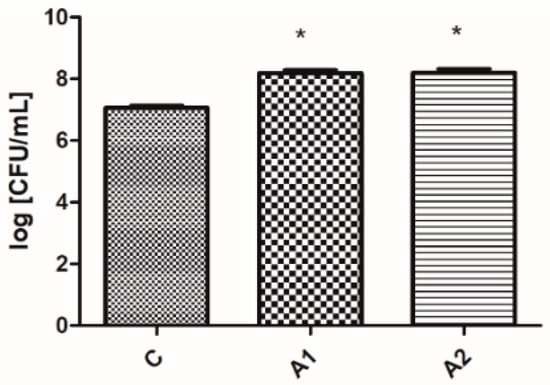 The logarithm of the number of colony-forming units (CFUs) on MRS medium per mL. * means that a column is significantly different at p ≤ 0.05. C—control group, A1 and A2—groups containing crude fibre concentrate.