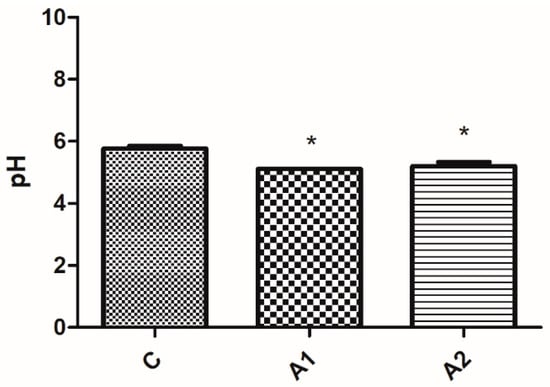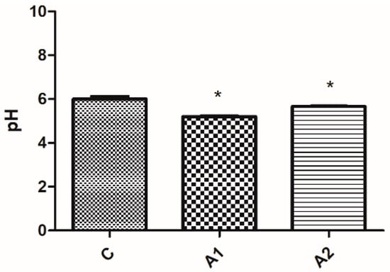 The pH values of the faeces from the birds from individual pens. * means that a column is significantly different at p ≤ 0.05. C—control group, A1 and A2—groups containing crude fibre concentrate.