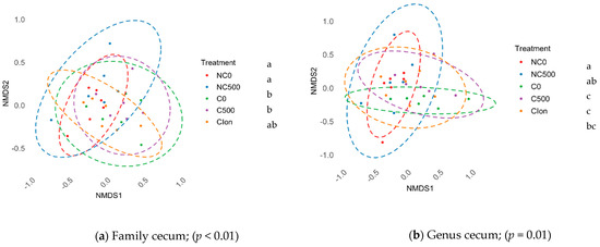 We detected no differences in the α-diversity indexes (Shannon and Simpson) or in the OTU count of different treatment pairs in the ileum and cecum (p > 0.05). In addition, the β-diversity assessed by NMDS from Bray–Curtis distance matrices and a permutational analysis of variance in the ileum section showed no differences in the microbiome between the treatments (p > 0.05). On the other hand, in the cecum, there were significant differences in the clustering position in the groups at the taxonomic levels of family, Figure 1a (p < 0.01), and genus, Figure 1b (p = 0.01). The results showed that NC0 and NC500 were different from C0 and C500, while C-Ion showed no differences against any treatment, except in the taxonomic category family, which was different from NC0, Figure 1.