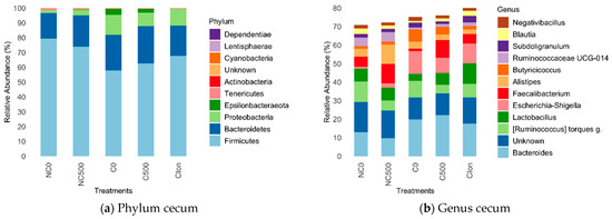 Figure 2 depicts the analysis of the relative abundance of different bacterial clades in the cecum at the phylum and genus level for each group of samples. In the cecum microbiota, Firmicutes was the dominant phylum (Figure 2a), with a relative abundance ranging from 57.8% (C0 treatment) to 79.4% (NC0 treatment). At the genus level (Figure 2b), Bacteroides was the taxon with the highest relative abundance (9.7–22.1%), highlighting their presence in the groups challenged, C0, C500, and C-Ion.