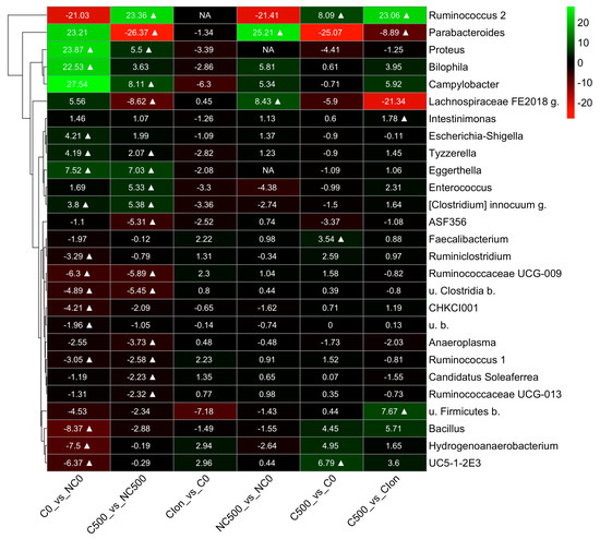 Heat map of the bacterial genus from the cecum of broiler chickens at 21d (9d p.i.). The color block in the heatmap indicates the normalized abundance log2 fold change (log2-fc) of each pair of groups at the bacterial genus: C0 vs. NC0; C500 vs. NC500; C-Ion vs. C0; NC500 vs. NC0; C500 vs. C0; and C500 vs. C-Ion. The positive and negative changes are indicated by the intensity of the green and red color, respectively. Significant changes (with an adjusted p ≤ 0.05) are marked with a symbol ∆. The non-available (NA) label indicates that the corresponding comparison was not performed as there were no counts for most of the samples of the group pair. A hierarchical clustering tree based on the log2-fc signals of the clades is shown to the left of the heatmap. The abbreviations u. b. and g. in the genus names stand for “unknown”, “bacterium”, and “genus”, respectively.