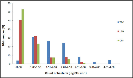 Salmonella spp. and L. monocytogenes were not detected in any of the 137 samples of raw DM examined. The number of E. coli, Enterobacteriaceae, total coliform bacteria, sulfite-reducing Clostridia and aerobic sporogenic bacteria was below the limit of quantification (<1 cfu mL−1) in all samples tested, as was the number of Bacillus cereus and yeasts and molds (<10 cfu mL−1). Proportion of DM samples with different number of total bacterial count (TBC), lactic acid bacteria (LAB) and coagulase-positive staphylococci (CPS) in the total number of 137 samples tested is listed in Figure 1.