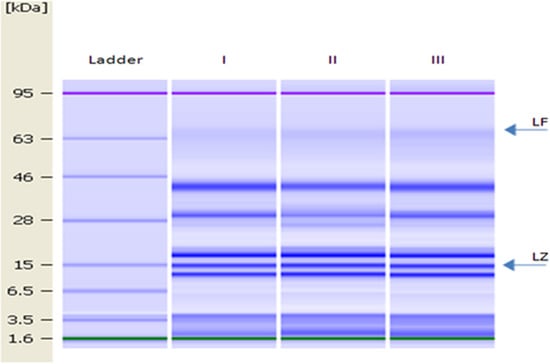 Lab-on-a-Chip gel images of lane 1, molecular mass ladder (1.6, 3.5, 6.5, 15, 28, 46, 63 and 95 kDa); lanes I–III, DM samples. Arrows indicate the position of LF and LZ.