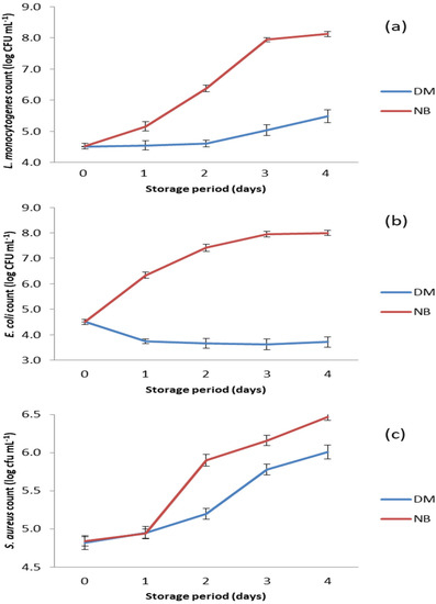Counts of bacteria tested in the DM and the nutrient broth (NB) during storage at 15 °C. (a) S. aureus count; (b) E. coli count; and (c) L. monocytogenens count.