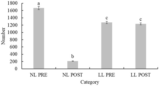 The number of juvenile European hedgehogs admitted to wildlife rehabilitation centres in the Czech Republic in the years 2011 to 2020, total 4388, divided into four categories by weight and timing of litter. Columns or bars with different letters (i.e., a versus b, a versus c, b versus c) indicate that they are statistically different from each other, while those with same letters (c versus c) indicate that they are not statistically different from each other. NL PRE = pre-weaned juvenile hedgehogs from normally timed litters; NL POST = post-weaned juvenile hedgehogs from normally timed litters; LL PRE = pre-weaned juvenile hedgehogs from late litters; LL POST = post-weaned juvenile hedgehogs from late litters.