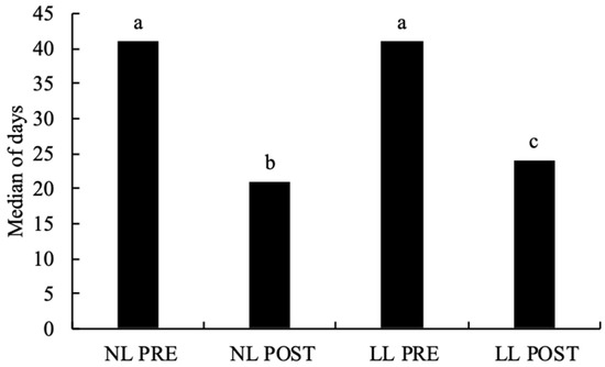 The length of stay in NL PRE (median 41 days) and LL PRE (median 41 days) young was significantly longer (p < 0.001) than in NL POST and LL POST young (median 21 and 24, respectively) (Figure 2).