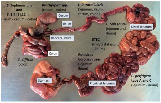 Following clinical evaluation, the most effective approach is to select three to five appropriate pigs (acutely affected and with representative clinical signs) that have not received antimicrobial treatments. Selected pigs should be humanely euthanized and submitted to post-mortem examination, through necropsy, to perform gross morphological diagnosis of the lesions and to collect samples for further diagnostic investigation (small intestine, colon, ileocecal valve and mesenteric lymph nodes). The necropsy can provide useful information for the orientation of the diagnosis, even if in most cases it is not possible to reach a definitive diagnosis based solely on the macroscopic findings observed. The information collected during the necropsy, such as the type of enteritis (catarrhal, fibrinous, necrotic, etc.), the localisation of the lesions (small and/or large intestine) (Figure 3) and its distribution (focal, diffused, segmental, etc.) can improve the formulation of a differential diagnosis [6].