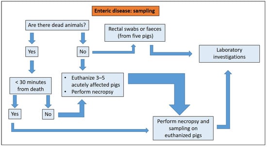 After collection, samples must be stored correctly. Improperly stored samples can invalidate the results of diagnostic tests. The diagnostic pathway of enteric disease includes sampling from dead and/or live animals (Figure 4).