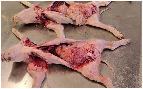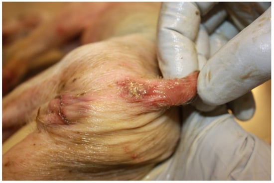 Affected pigs are usually depressed with a reduced appetite, and may vomit or show a rough, sticky, wet hair coat. Death occurs commonly 12–24 h after the onset of diarrhoea [11]. In a low proportion of pigs, death occurs before the development of diarrhoea. In severe cases, dehydration can determine the loss of 30–40% of total body weight and piglets can show sunken eyes and the exaggeration of bony prominences. The anus and perineum may present redness due to the contact with the alkaline diarrhoeic faecal material (Figure 5).