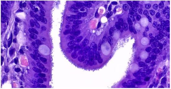 The microscopic lesions in pigs infected by ETEC consist of multifocal aggregates of rod-shaped, basophilic bacteria on the brush borders of the small intestine enterocytes (Figure 9). Mild villous atrophy and an increased number of neutrophils may be observed in the superficial lamina propria [9].