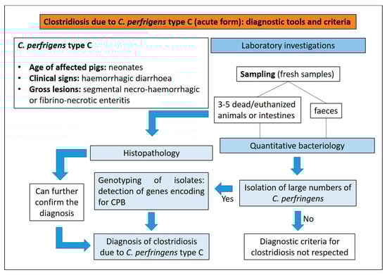 Quantitative bacteriology performed on intestinal contents and/or faeces, in order to demonstrate large numbers of C. perfringens type C, is recommended to confirm a final diagnosis of clostridiosis [16]. On blood agar, after 24 h of anaerobic incubation at 37 °C, C. perfringens type C, as all other types of C. perfringens, normally forms a characteristic double zone of haemolysis. Following culture, the genotyping of isolates using a multiplex PCR test to detect genes for the major toxins is the most common method to identify C. perfringens type C (Figure 11).