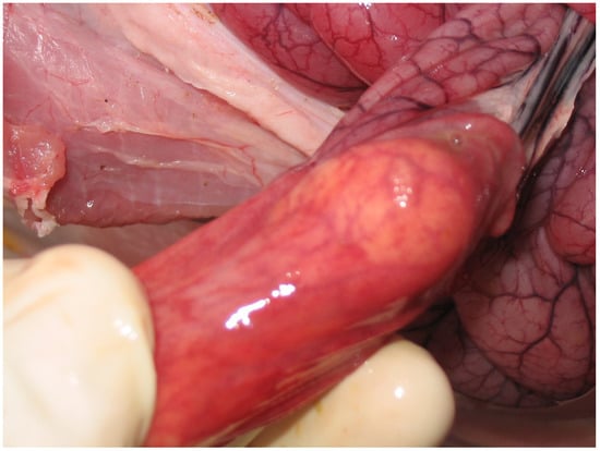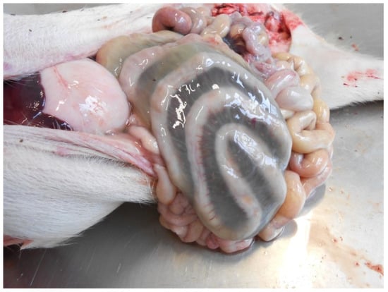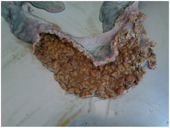 Colibacillosis cannot be readily differentiated from the other common causes of diarrhoea based solely on gross findings, without laboratory investigations [12]. Piglets affected by neonatal and post-weaning colibacillosis usually show a dilated stomach full of clotted milk or dried feed, with hyperaemia of the fundus and venous infarcts on the greater curvature (Figure 6).
