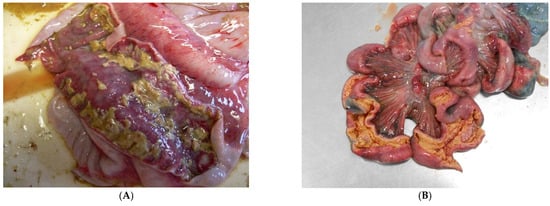 Acutely affected piglets showing haemorrhagic diarrhoea may die soon after the onset of clinical signs or 24–48 h after the onset of symptoms [15,16]. They have brown–red diarrhoea containing grey shreds of necrotic material and show dehydration. Perineal cutaneous lesions may occur and piglets rapidly show weakness and die [17].