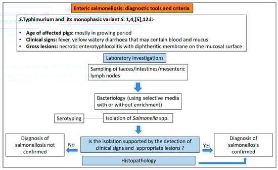 The diagnosis of enteric disorders in pigs requires the combination of several diagnostic techniques. Some of them, such as quantitative bacteriology and quantitative real time PCR, can demonstrate the quantitatively significant presence of an aetiological agent, necessary for a definitive diagnosis. In many cases the sole isolation of the pathogen cannot allow a conclusive diagnosis. Confirmation of pathogenicity by the demonstration of virulence factors, such as genes encoding for toxins, is needed (e.g., enterotoxigenic Escherichia coli, C. perfrigens, C. difficile, etc.). The use of histology is of fundamental value to correlate typical microscopic lesions with the isolation of a certain aetiological agent, and to verify the co-localization of specific antigens (belonging to potential aetiological agents) associated with lesions using immunohistochemistry techniques.
