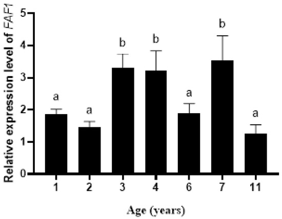 Relative expression levels of the FAF1 gene in testis tissues of different ages (different letters indicate significantly different values at p < 0.05).