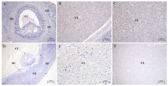 Localization of FAF1 protein expression in ovaries of different reproductive cycle phases. (A–F) Immunohistochemical staining. (A–C) Positive expression of FAF1. (D–F) Negative control of FAF1. (A,D) are follicular stage ovaries; (B,E) are luteal phase ovaries; (C,F) are ovaries during pregnancy; SG: granulosa cell; GE: germ epithelial cells; TF: follicle membrane cells; CL: luteal cells; CC: cumulus cell.