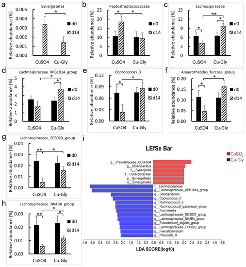 - Zhang, Y.; Zhou, J.; Dong, Z.; Li, G.; Wang, J.; Li, Y.; Wan, D.; Yang, H.; Yin, Y. Effect of dietary copper on intestinal microbiota and antimicrobial resistance profiles of Escherichia coli in weaned piglets. Front. Microbiol. 2019, 10, 2808. [Google Scholar] [CrossRef] [PubMed]
