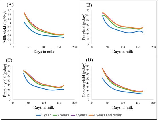 Lactation curves for daily yields of milk, fat, protein, and lactose for different ewe ages are presented in Figure 1. Overall, milk, fat, protein, and lactose yields declined over the course of lactation (from 35 to 164 days in milk), and no initial peak was observed. This descending trend is not only a physiological occurrence, but it is also likely to be a result of reduced pasture quantity and quality in this seasonal pasture-based system. An atypical increase towards the end of the season (between 100 and 150 days in milk) was observed in the lactation curves for different ewe ages, mainly for fat and protein yields (Figure 1B,C). Lactation curves for one-year-old ewes are visually distinct from the lactation curves of two-, three-, and four-year and older ewes (Figure 1). Overall, milk yield increased with age (parity), with 3-year-old ewes producing the highest yields, which then descended afterwards, producing more than 4-year-old ewes.